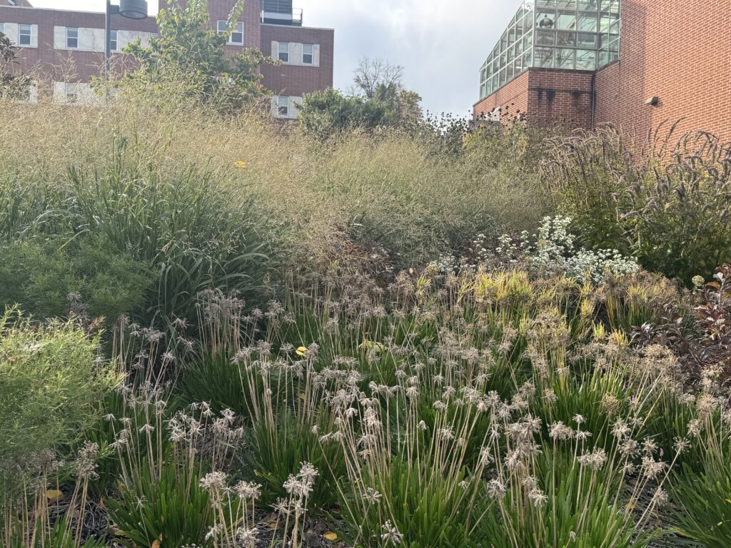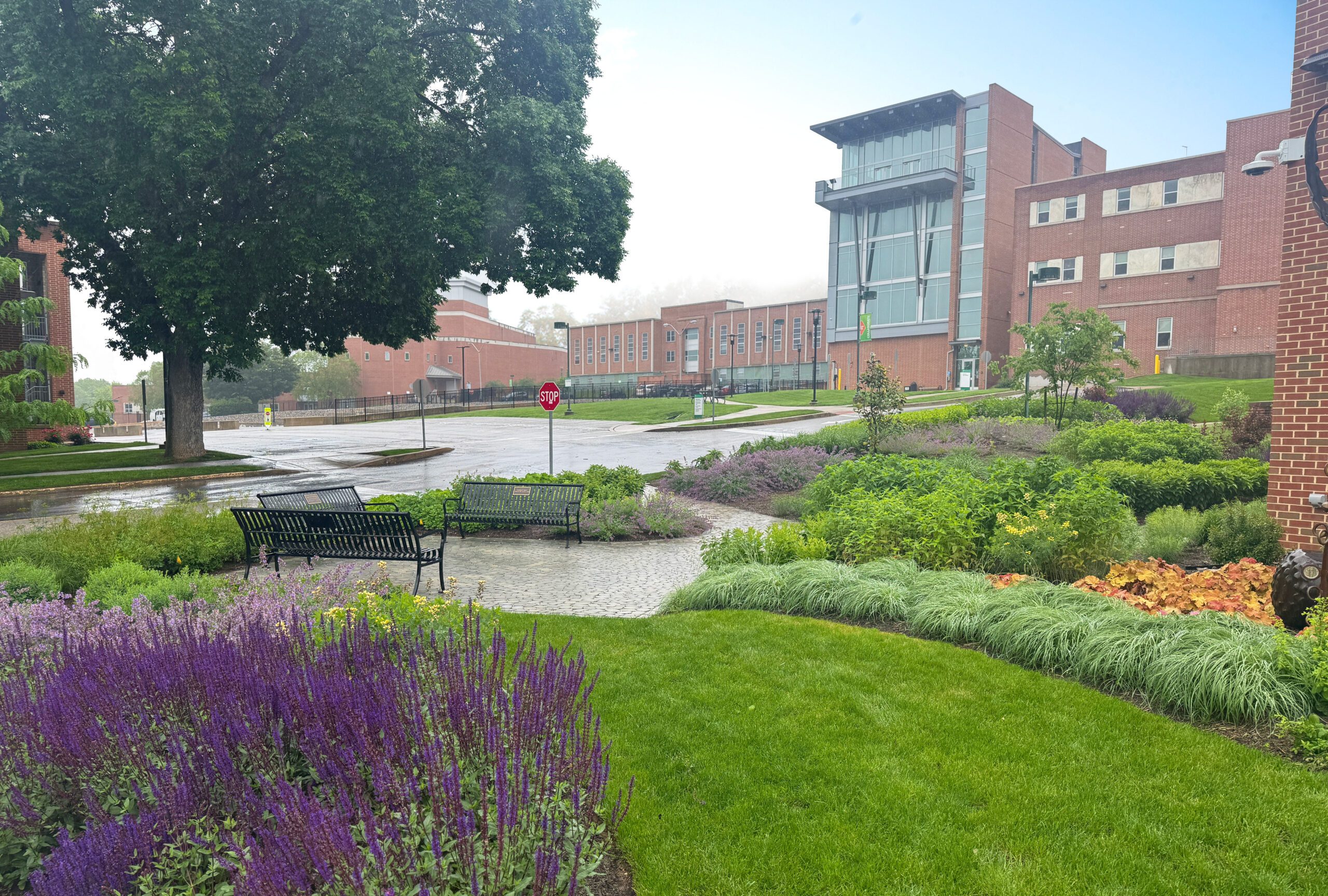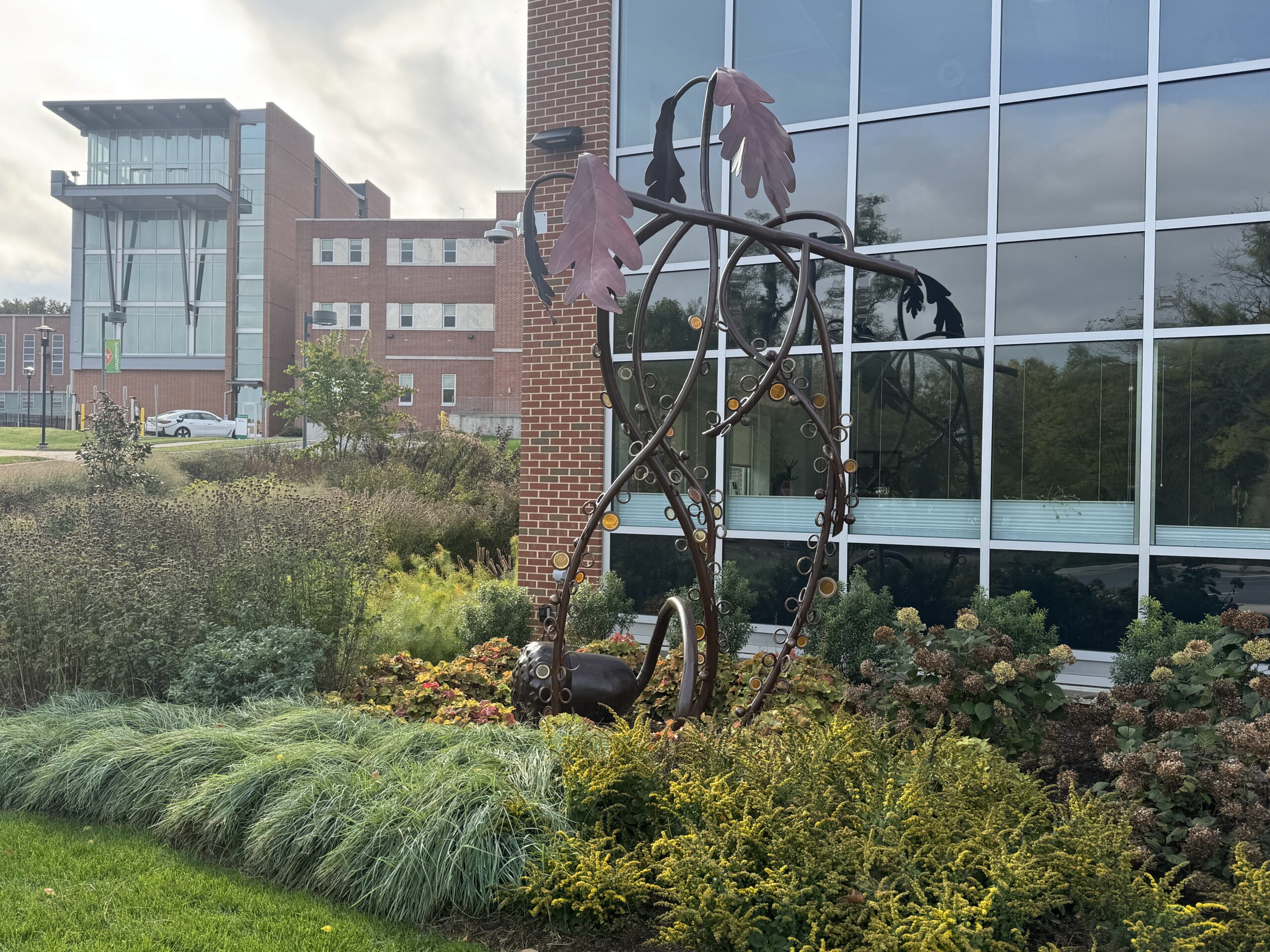 The landscape surrounding this newest campus building is designed to showcase a plant collection for learning, featuring native and non-native, resilient pollinator plants. The rich perennial composition is a first for York College and provides seating spaces for student leisure or study breaks. A dramatic sculpture commissioned by local artist Patrick Sells anchors the view of the front entrance.