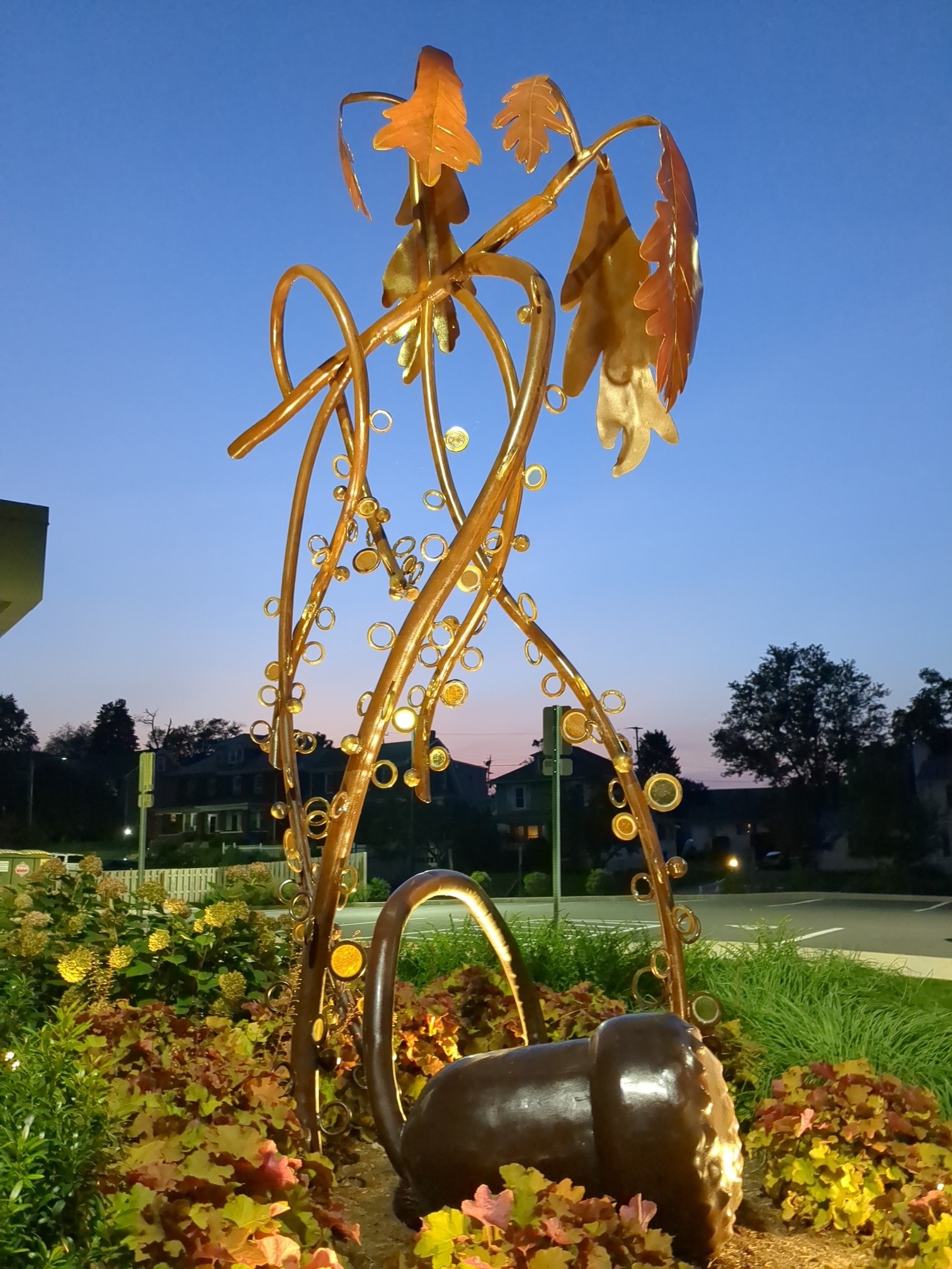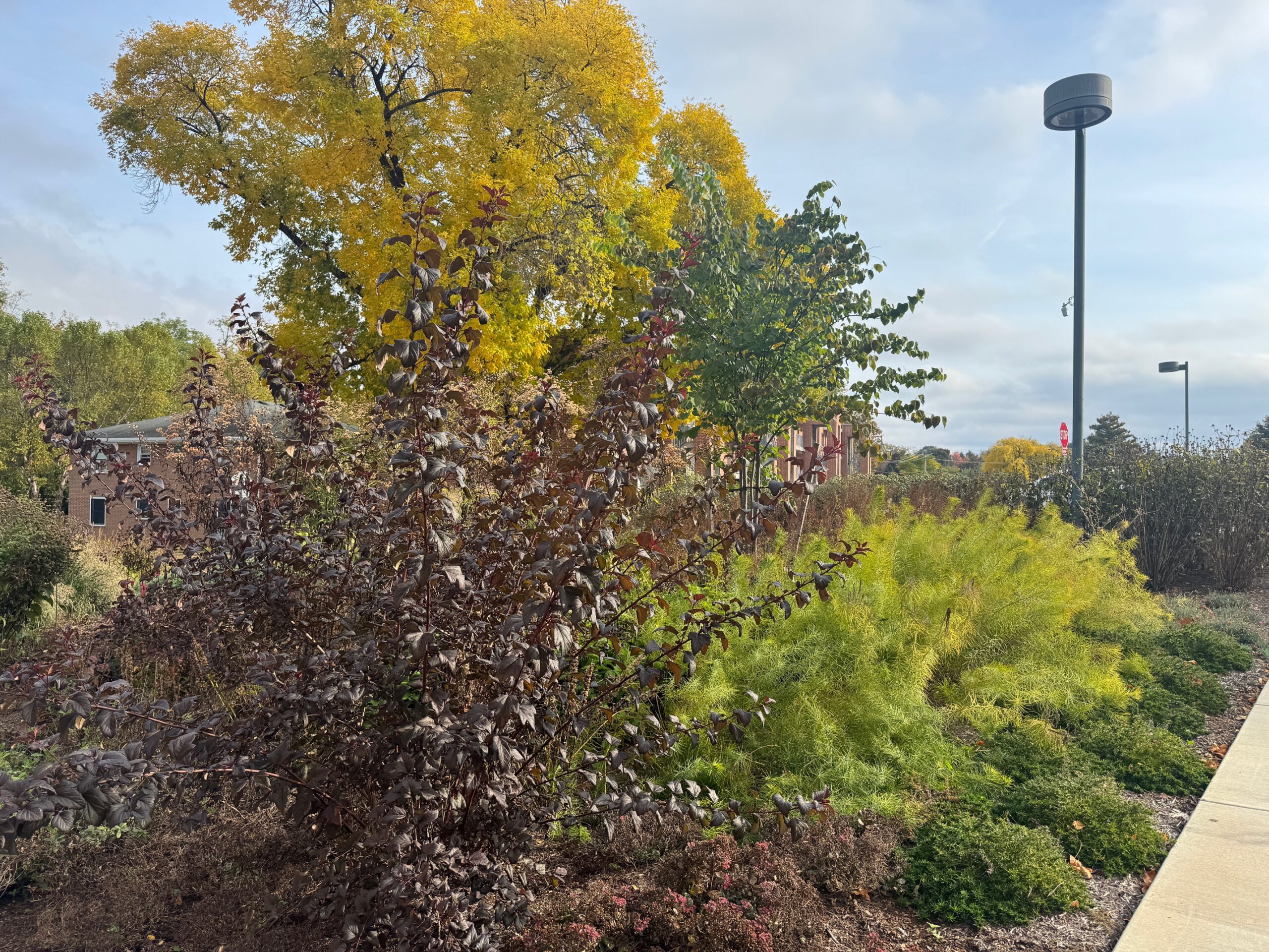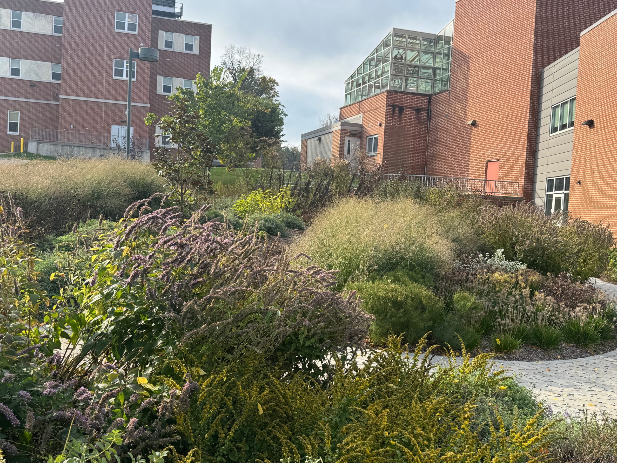 The landscape surrounding this newest campus building is designed to showcase a plant collection for learning, featuring native and non-native, resilient pollinator plants. The rich perennial composition is a first for York College and provides seating spaces for student leisure or study breaks. A dramatic sculpture commissioned by local artist Patrick Sells anchors the view of the front entrance.